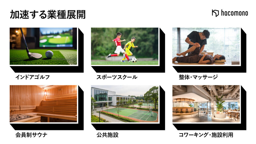 フィットネス業界を中心にスタートしたhacomonoですが、近年は24時間ジム、ピラティススタジオなどの新業態に加え、スポーツスクールや公共施設、インドアゴルフ、レジャー、リラクゼーションなどへと、ウェルネス領域全体にまで利用の幅が拡大しています。現在では、導入企業の約4割をフィットネス以外の業種が占めています。