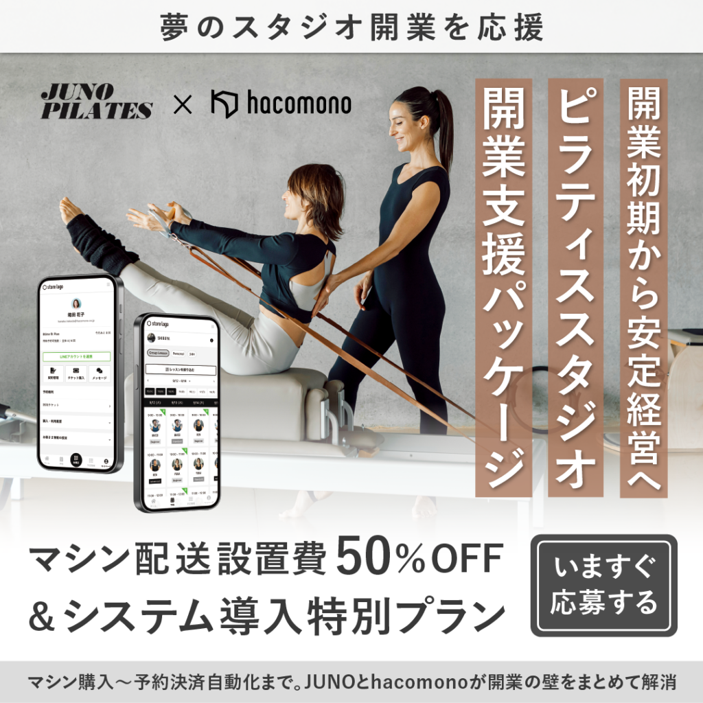 こうした課題に対しhacomonoでは、「開業時だけでなく、運営が軌道に乗るまでを支える支援」が必要だと考え、マシンピラティス領域で豊富な知見を持つJUNO PILATESとの連携を強化することとしました。