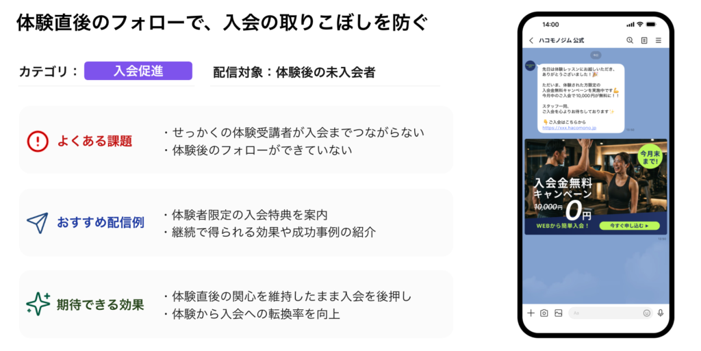・体験後、一定期間内に入会していない会員へフォローメッセージを配信