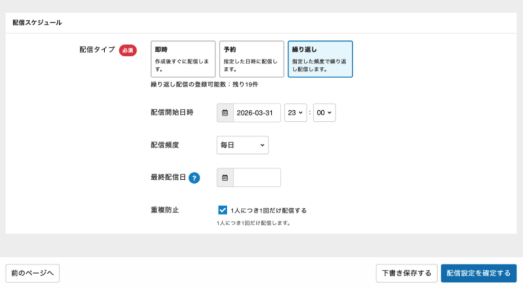 特に「繰り返し」は、一度設定すれば自動で定期的な配信が可能となり、作業の負荷を大幅に軽減します。これにより、日々の会員フォローを抜け漏れなく、継続して運用できます。